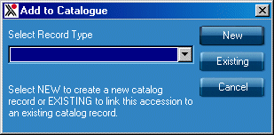 When your Accession Record is complete you can "add" it to the Catalogue database. This may be done either by creating a new catalogue record based on the Accession record, or alternatively by linking the Accession record to an existing Catalogue record, both methods are described below.