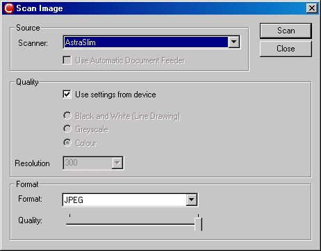 - Select the Acquire from scanner or camera... option, the Scan Image dialogue appears, as shown below